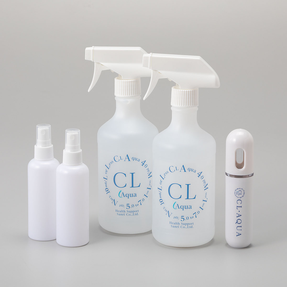 「イオンレス次亜塩素酸水シーエルアクア」と、すぐに使えるスプレーボトル、さらに携帯用小型噴霧器がセットになった、除菌初心者にもおすすめのスターターキットです。