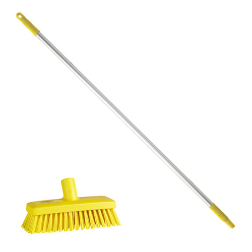 コンパクトサイズのデッキブラシ。外側の毛束は角度がついており、床の隅まで洗浄できます。