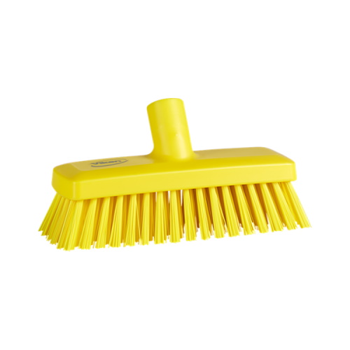 コンパクトサイズのデッキブラシ。外側の毛束は角度がついており、床の隅まで洗浄できます。