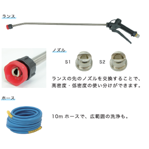 エアー配管やコンプレッサーと接続することで、きめ細かいムース状の泡を効率良く広範囲に散布することができる発泡洗浄機です。